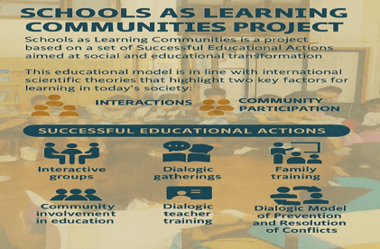 Description: Schools as Learning Communities (SLC) is an educational transformation project grounded in scientific evidence and implemented in Spain, Latin America, and Europe. Its foundation lies in Successful Educational Actions, which are interactive groups, dialogic literary gatherings, family training, community involvement in education, dialogic teacher training and Dialogic Model of Prevention and Resolution of Conflicts. These actions foster educational success and social cohesion through egalitarian dialogue, collaboration, and inclusivity.